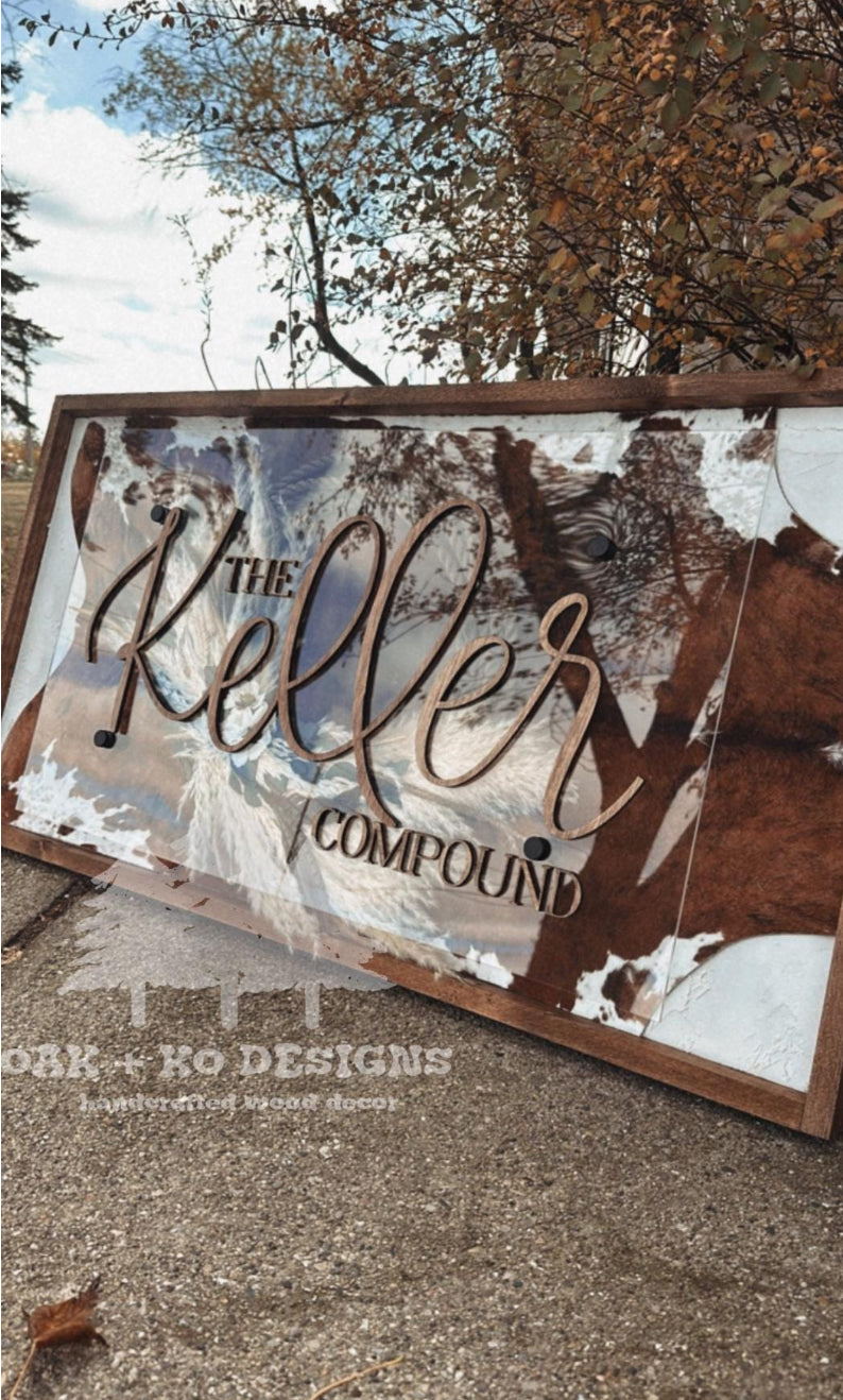 Crafted with a stained wooden frame, each sign features a combination of cowhide, rope, feathers, and dried florals, with a textured white plaster background. The acrylic overlay and laser-cut lettering add dimension and depth, blending a sleek, modern feel with rustic charm. Please note that the cowhide pattern may vary, making each sign truly one-of-a-kind.